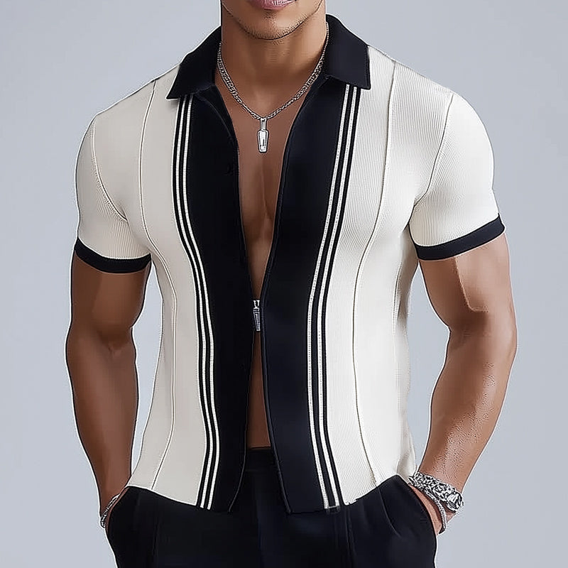 Men's Slim Fit Knitted Shirt | Black White Color Block Lapel | Zipper Closure | Soft Cotton Spandex Blend | Modern Business Casual Style | Breathable Fabric | M-3XL Sizes | Eye-Catching Elegant Design
