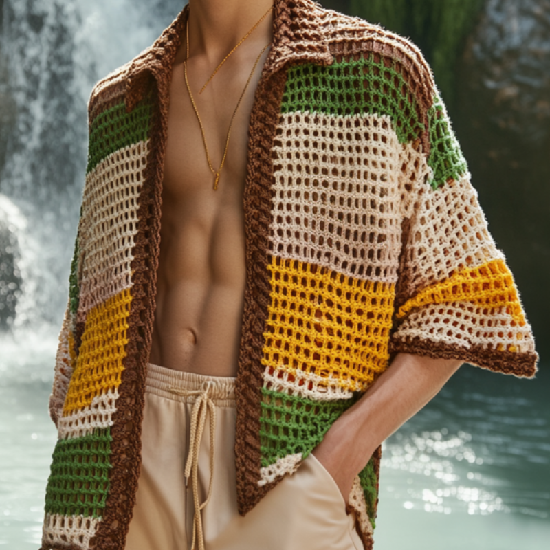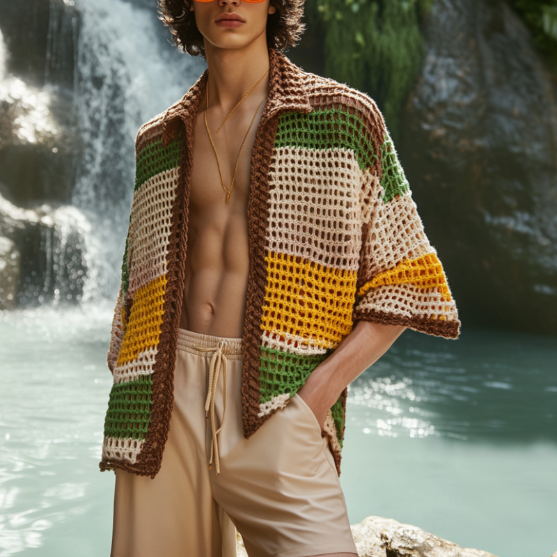 Introduce a stylish layer to your wardrobe with the Men's Casual Contrast Color Knitted Loose Collar Short Sleeve Cardigan. This uniquely designed cardigan combines comfort with contemporary fashion, featuring a loose collar and a pleasing contrast color scheme. Ideal for casual outings, layered looks, or relaxing at home, this cardigan provides versatility and style for the modern man.