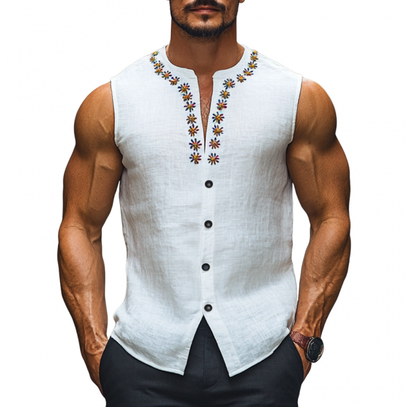The Men’s Casual Daisy Embroidery Breathable Linen Round Neck Slim Fit Sleeveless Shirt blends floral artistry with summer comfort. Its breathable linen fabric, charming embroidery, and slim fit design make it a perfect choice for casual, warm-weather occasions. Whether styled simply or layered, it ensures you stay cool, stylish, and effortlessly fashionable during your outdoor adventures or leisure time.
