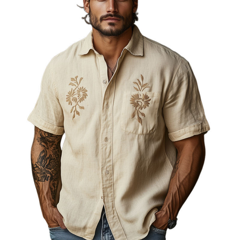 Product Name: Men's Casual Khaki Tencel Vintage Embroidered Short-Sleeved Shirt