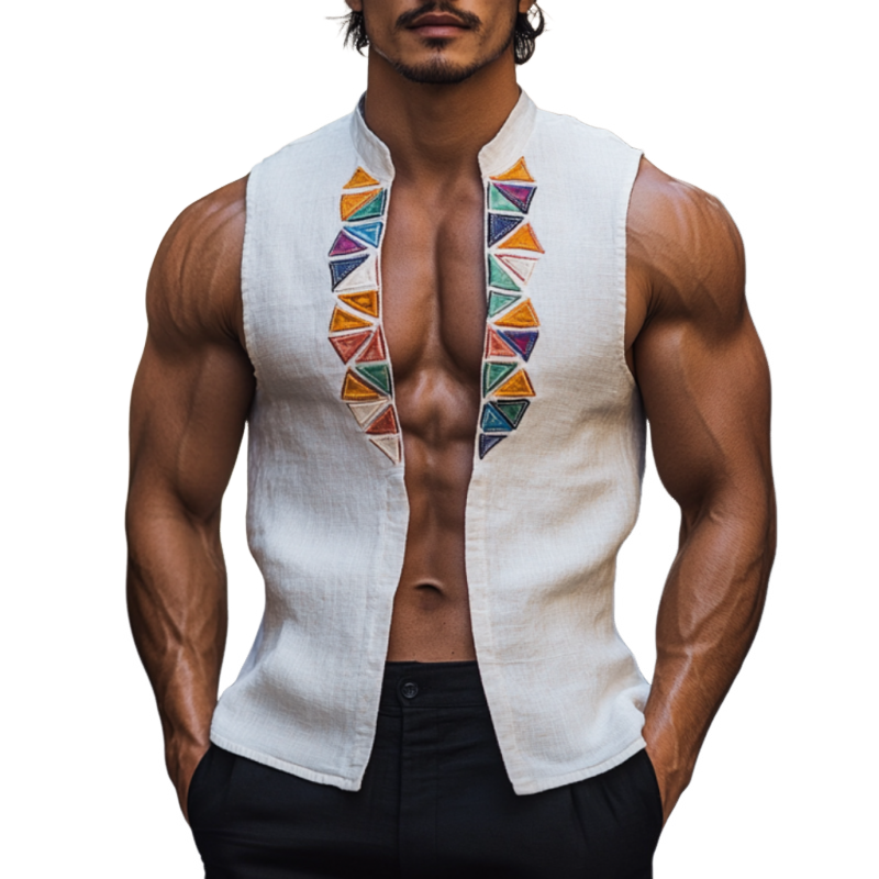 Introducing the Men's Casual Linen Stand Collar Colorful Triangle Embroidery Sleeveless Shirt, a vibrant and stylish addition to your summer wardrobe. This shirt combines a distinctive stand collar design with colorful triangle embroidery, making it a perfect choice for those looking to express their individuality while enjoying comfort and breathability. Crafted from lightweight linen, this sleeveless shirt is ideal for warm days, offering versatility and flair for various occasions.