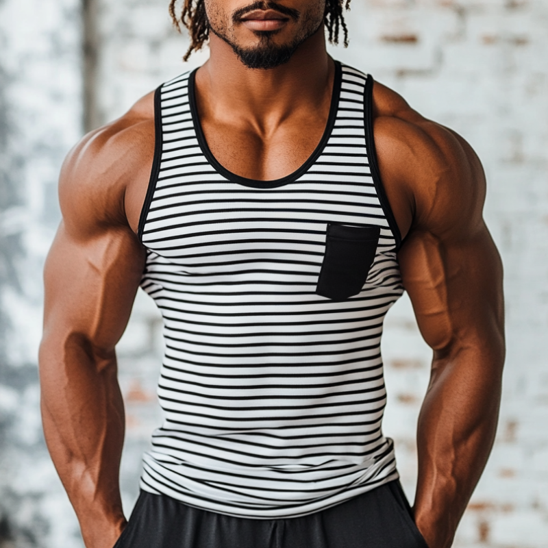 Men's Tank Top | Casual Striped U-Neck | Patch Pocket | Slim Fit | Soft Breathable Fabric | Trendy Summer Style | Versatile Layering | Comfortable Workout & Casual Wear
