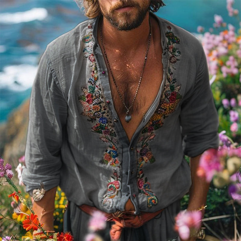 Description: This is a men's casual vintage embroidered long sleeve shirt, designed to blend classic vintage charm with modern comfort. It features intricate embroidery that adds a unique touch of elegance and sophistication, making it a standout piece in any wardrobe. Perfect for casual outings, social events, or even a relaxed day at work, this shirt effortlessly combines style and practicality.