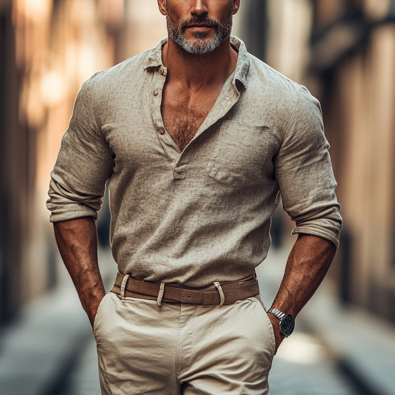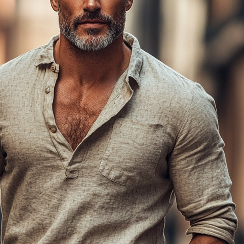 Men's Long Sleeve Pullover Shirt | Cotton Linen Blend | Breathable Lightweight Fabric | Casual Semi-Formal | Versatile Colors | Durable and Comfortable