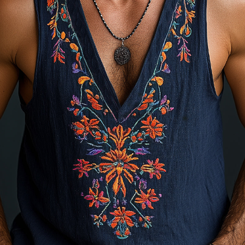 Embrace a touch of vintage charm with our Men's Deep V-Neck Vintage Floral Embroidered Cotton and Linen Tank Top. This unique piece merges timeless embroidery with modern design, offering a stylish and breathable option for summer. Perfect for outdoor events or casual summertime gatherings, it’s a standout addition to any collection.