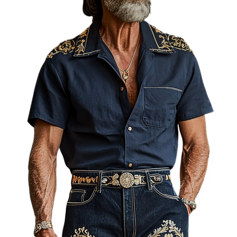 Men's Retro Embroidered Lapel Shirt | Short Sleeve | Vintage Style | Breathable Fabric | Button-Up Front | Casual Outings | Festivals | Relaxed Fit | Soft Cotton Blend | Notched Collar | Stylish Retro Flare