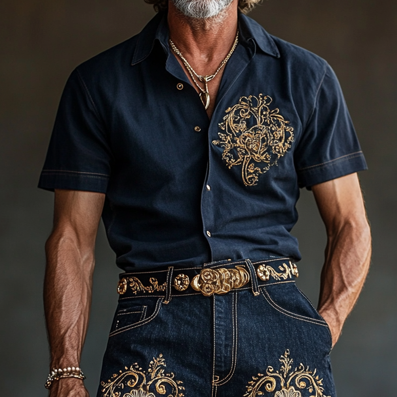 The Men's Fashion Retro Embroidered Lapel Short Sleeve Shirt combines nostalgic embroidery with classic design. Its stylish lapel, retro details, and comfortable fit make it a versatile and eye-catching addition to your casual wardrobe.