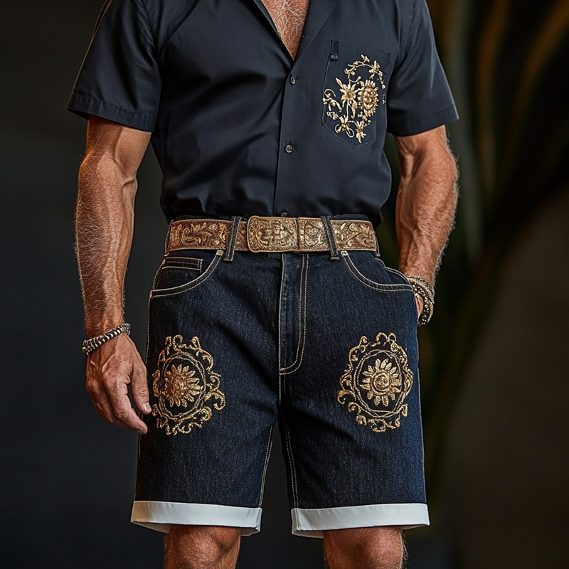 Men's Vintage-Inspired Embroidered Denim Shorts | Retro Straight-Leg Design | High-Quality Durable Fabric | Above-The-Knee Casual Fit | Perfect for Festivals & Weekend Outings | Classic Nostalgic Style