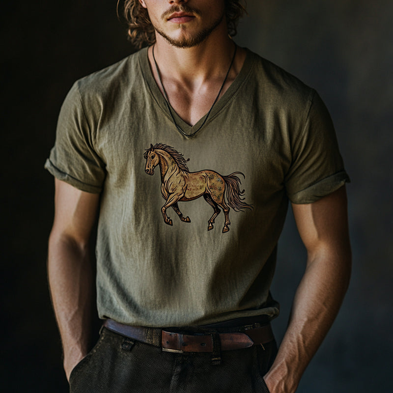 Men's V-Neck T-Shirt | Horse Print Short Sleeve | Comfortable Cotton Blend | Fashionable Casual Wear | Available in Sizes S-3XL | Unique Equestrian Design