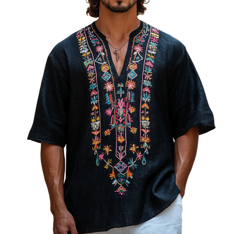 Description:Discover effortless style with our Men's Retro Casual Aztec Embroidered V-Neck Linen Short Sleeve Shirt. This shirt combines traditional Aztec designs with a modern casual fit, making it a versatile addition to any wardrobe. Ideal for those who appreciate both comfort and unique fashion statements, it is perfect for casual outings and laid-back gatherings.