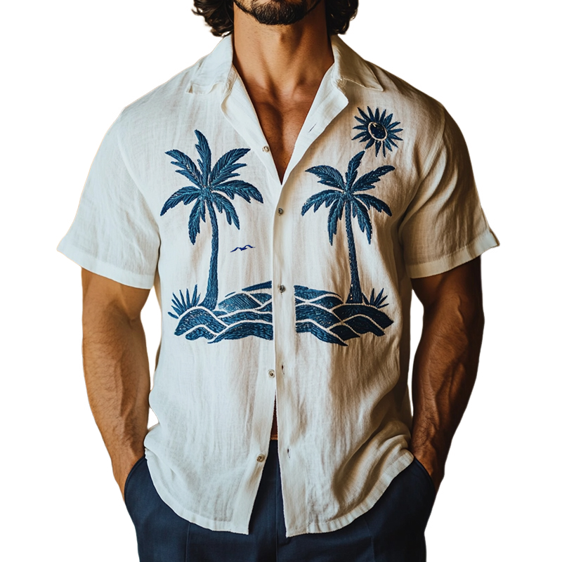 Product Name:Men's Retro Casual Beach Coconut Tree Embroidery Linen Lapel Short Sleeve Shirt