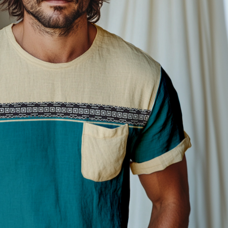 Men's Retro Casual T-Shirt | Colorblock Printed | Linen Material | Round Neck | Short Sleeve | Vintage Style | Comfortable Fit | Breathable Fabric | Versatile Look | Fashionable Top