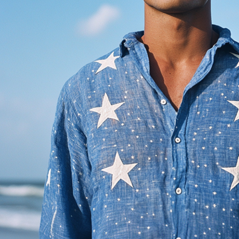 In summary, the Men's Retro Casual Linen Print Star Embroidery Lapel Long Sleeve Shirt is a must-have for those who appreciate a blend of comfort, style, and individuality. Its breathable linen fabric, eye-catching embroidery, and timeless design make it a perfect choice for any fashion-forward man seeking to make a statement.