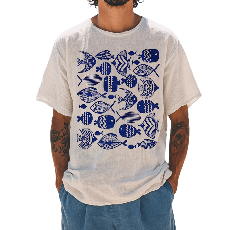 Men's Ocean Print Linen T-Shirt | Retro Casual Short Sleeve | Round Neck | Vintage Beachwear Top | Breathable Lightweight Fabric | Sizes S-3XL | Summer Comfort