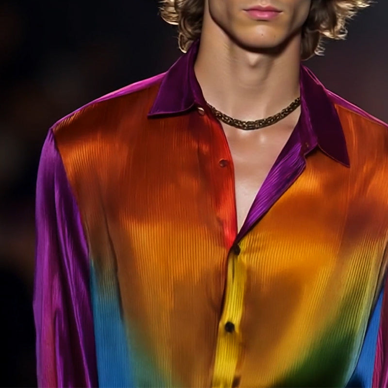 Men's Retro Rainbow Print Shirt | Long Sleeve | Light Lapel | Casual Fit | Vibrant Design | Trendy Style | Comfortable Polyester | Multiple Sizes | Perfect for Casual Outings & Social Events