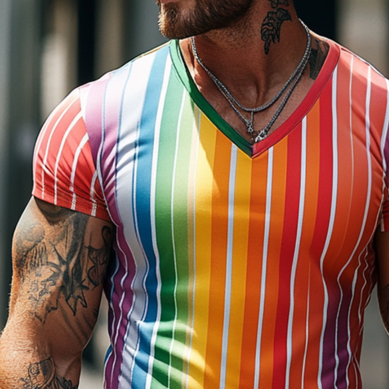 Men's Retro V-Neck T-Shirt | Rainbow Stripe Print | Short Sleeve Casual Top | Soft Cotton Fabric | Vintage-Inspired Design | Comfortable Everyday Wear | Various Sizes S-3XL | Spring & Summer Fashion