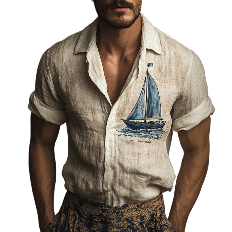 Men's Linen Short Sleeve Shirt | Retro Sailing Print | Casual Lapel Collar | Lightweight & Breathable | Vintage Nautical Style | Comfortable Fit | Spring & Summer Wardrobe | Versatile & Stylish