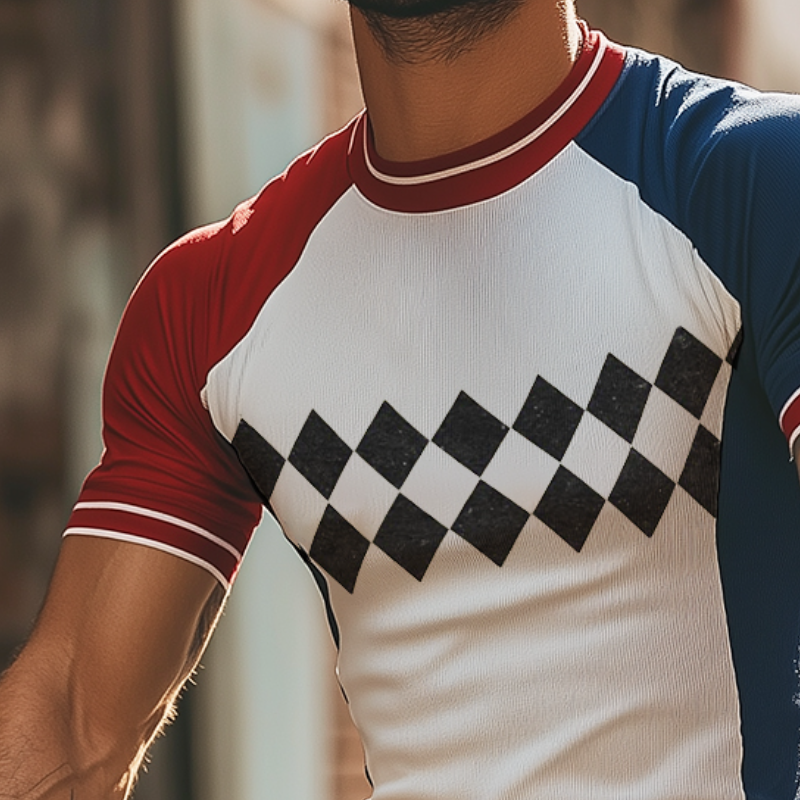 Men's T-Shirt | Retro Sports Style | Diamond Print | Colorblock Design | Round Neck | Short Sleeve | Breathable Fabric | Comfortable Fit | Casual & Active Wear