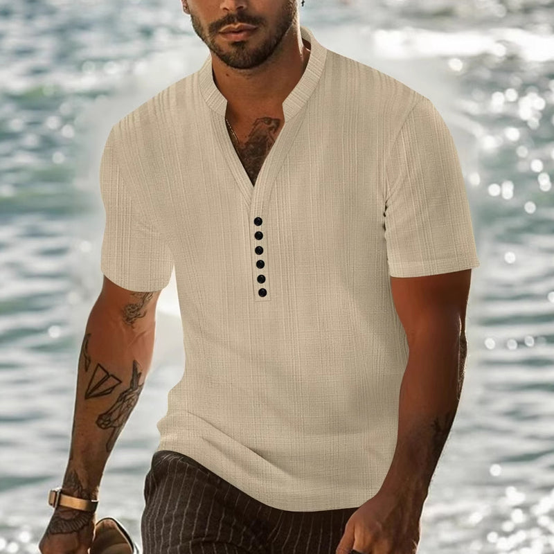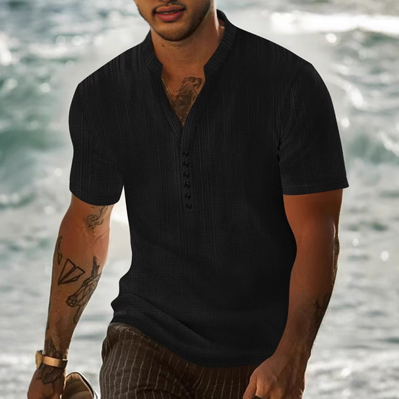 The Men's Solid Color Casual Pullover Button Short-Sleeved T-shirt is a must-have for those seeking simplicity paired with modern flair. Whether dressing down for a casual day out or elevating your style for an evening occasion, this T-shirt provides the perfect balance of comfort and elegance.