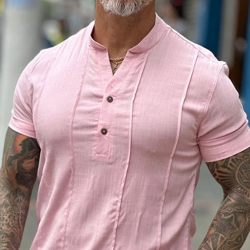 Experience a perfect blend of comfort and casual sophistication with this solid-colored cotton and linen shirt. Designed with a classic Henley collar, it features a buttoned placket that adds a relaxed yet refined touch. Crafted from breathable cotton and linen fabric, this short-sleeve shirt is ideal for warm weather, outdoor outings, or casual gatherings. Its lightweight, textured material ensures all-day comfort, making it an effortless addition to your casual wardrobe.