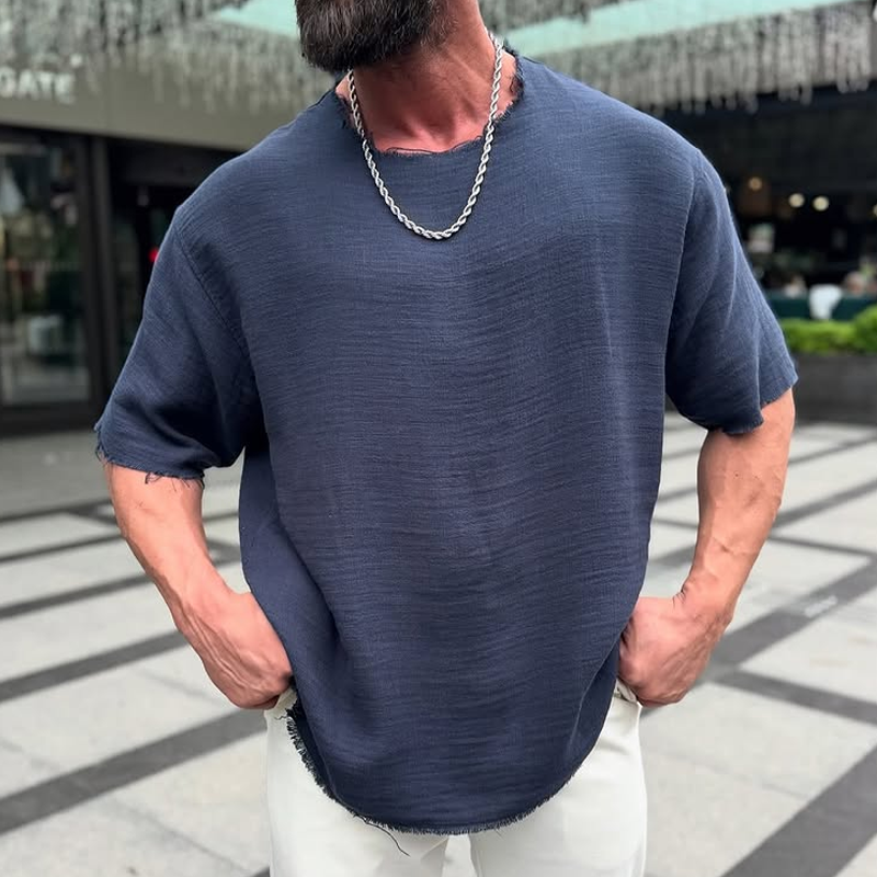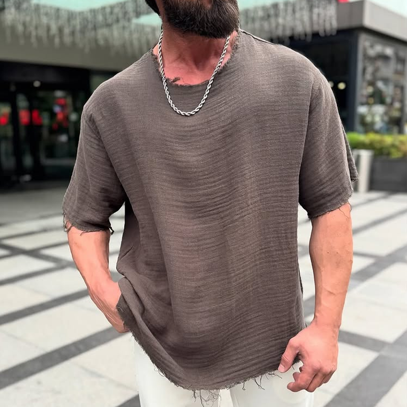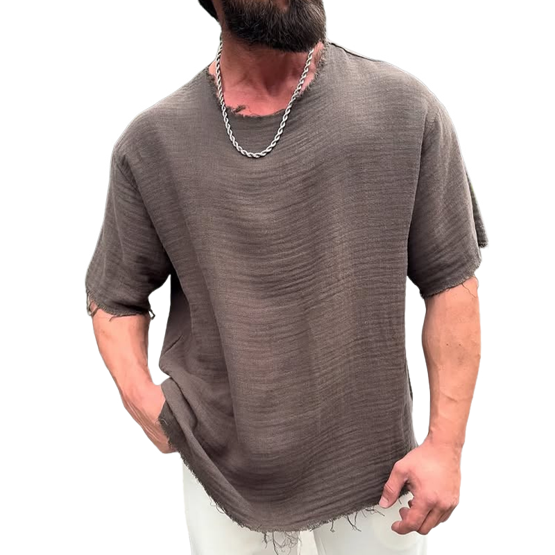 Men's T-Shirt | Solid Cotton Linen | Rough Edge Detail | Round Neck | Short Sleeve | Breathable Lightweight Fabric | Casual Versatile Style | Ideal for Warm Weather | Distressed Fashion Element
