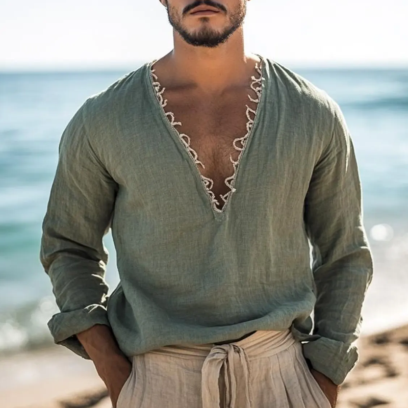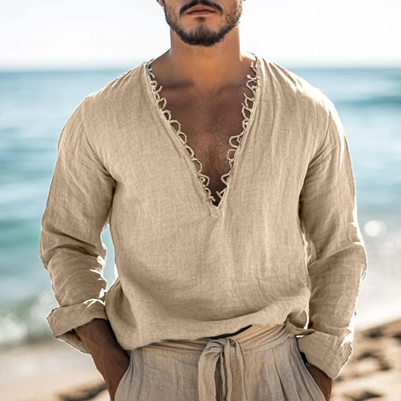 Men's V Neck Long Sleeve Shirt | Solid Cotton Linen Blend | Casual Comfortable Top | Premium Breathable Material | Versatile Stylish Design | Regular Fit | Ideal for All Seasons | Multiple Sizes Available