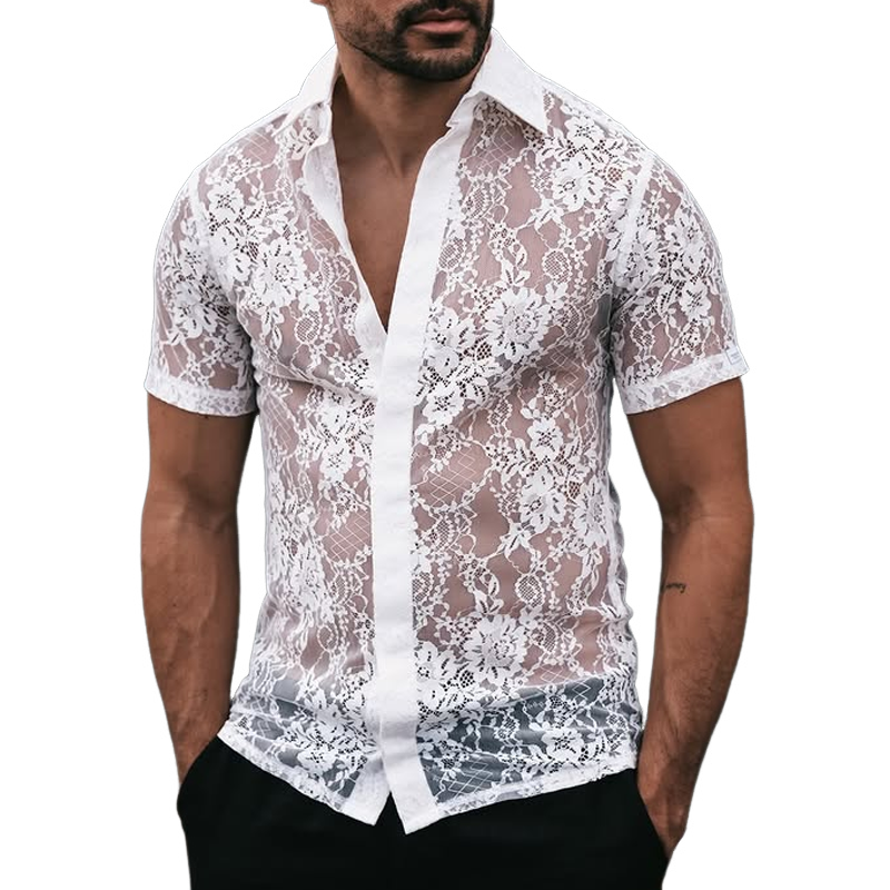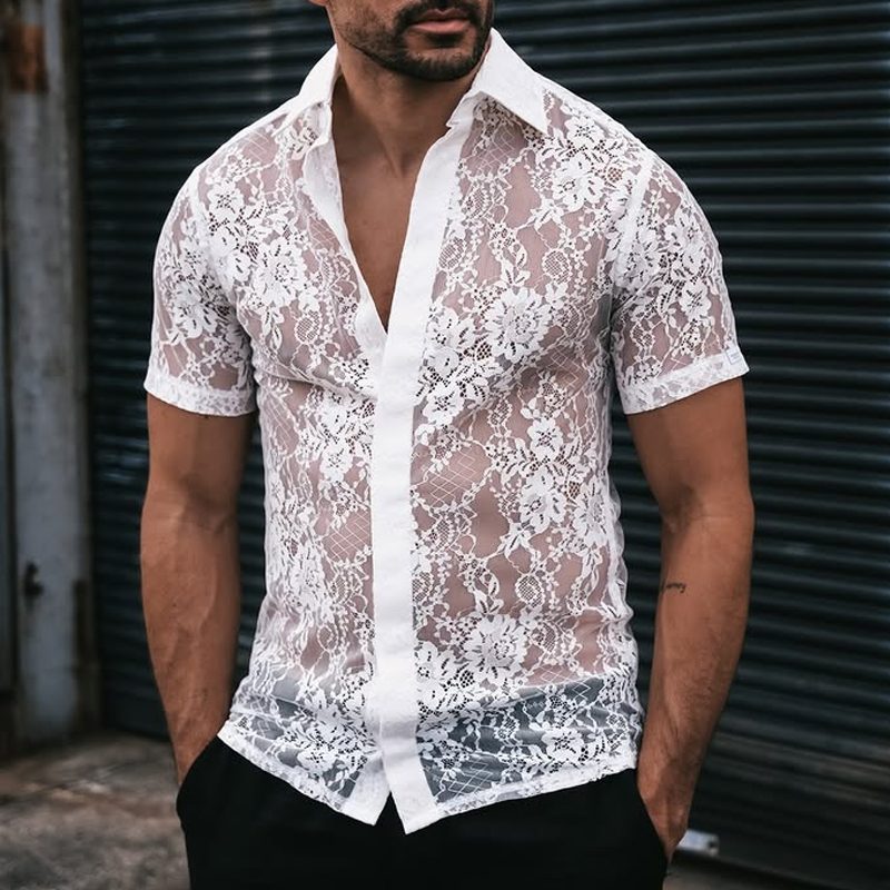 Men's Casual Shirt | Solid Color | Lace Lapel Detail | Short Sleeve | Single Breasted | Comfortable Breathable Fabric | Relaxed Fit | Stylish & Chic | Perfect for Casual & Semi-Formal Events