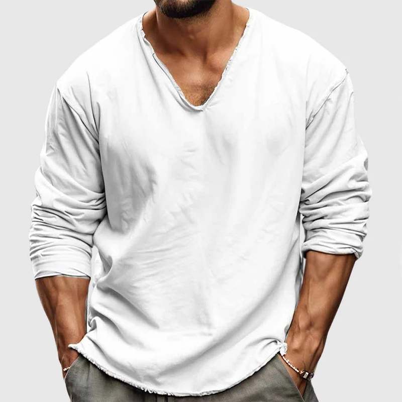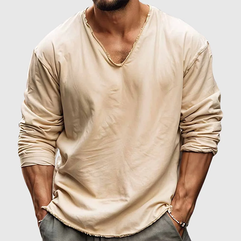 Men's V Neck Long Sleeve T-Shirt | Solid Color | Rolled-Up Sleeves | Loose Fit | Casual Comfort | Versatile Everyday Top