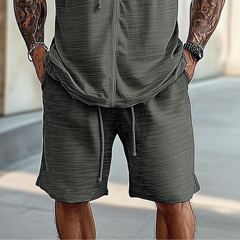 This casual set is ideal for a laid-back summer style. Pair it with your favorite sneakers and a sleek cap for an effortlessly sporty look. Consider adding a watch or simple bracelet for an added touch of personality.