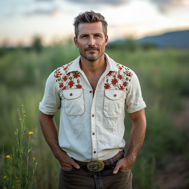 Men's Summer Cotton Floral Embroidery Short Sleeve Shirt
