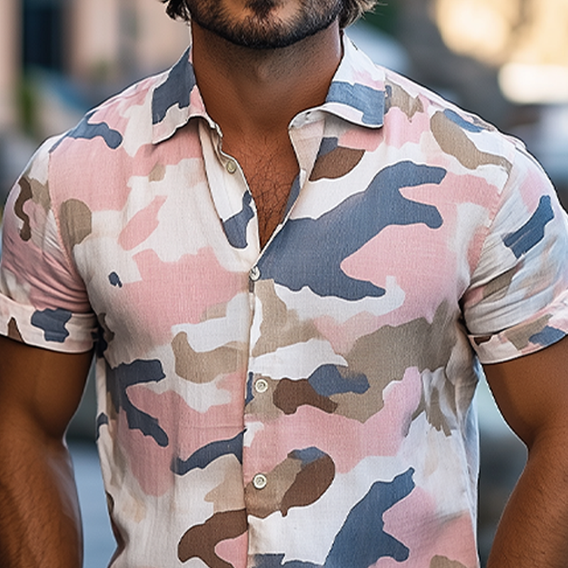 Men's Camouflage Short-Sleeved Shirt | Summer Cotton Linen Blend | Casual Button-Down | Breathable Relaxed Fit | Trendy Print for Outdoor Adventures and Casual Outings