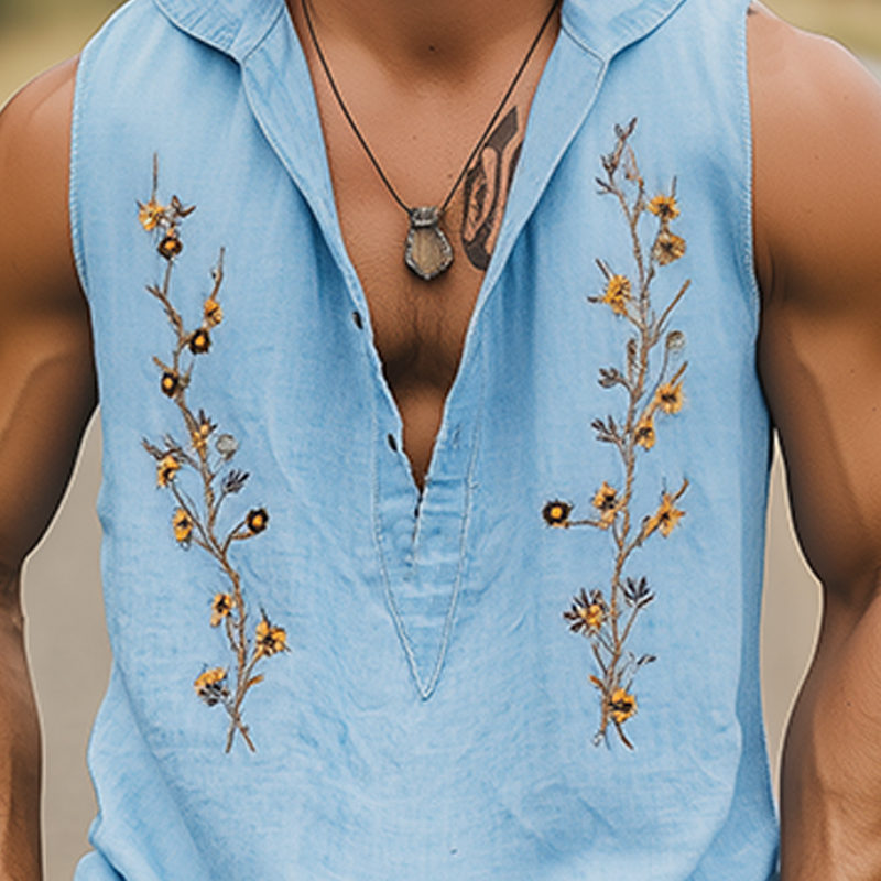 Men's Floral Embroidery Hooded Tank Top | Cotton Linen Blend | Deep V-Neck Casual Summer Shirt | Stylish & Breathable | Relaxed Fit | Ideal for Layering | Versatile Fashion for Warm Weather