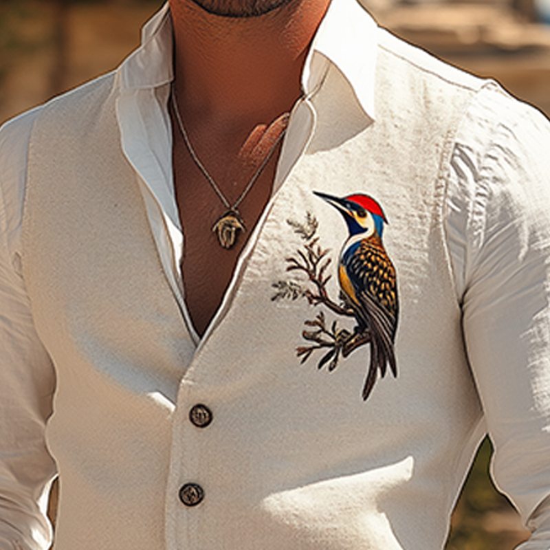 Men's Hawaiian Style Vest | Summer Cotton Linen | Embroidered Woodpecker Design | Casual Fashion | Lightweight & Breathable | Tropical Vibe | Relaxed Fit | Nature-Inspired Accent | Easy Care