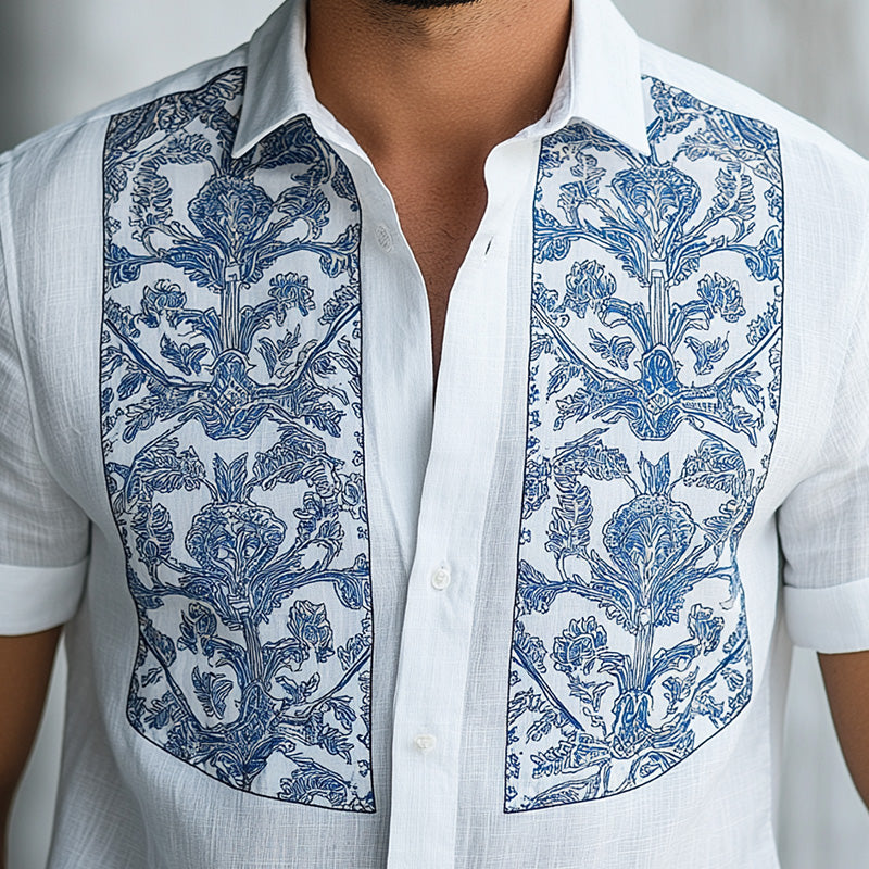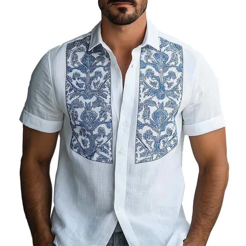 The Men's Summer Fashion Porcelain Pattern Printed Cotton and Linen Short Sleeve Shirt is the epitome of comfortable elegance, combining breathable materials with an elegant design. Perfect for both leisure and social gatherings, this shirt will undoubtedly become a staple piece in your summer collection.