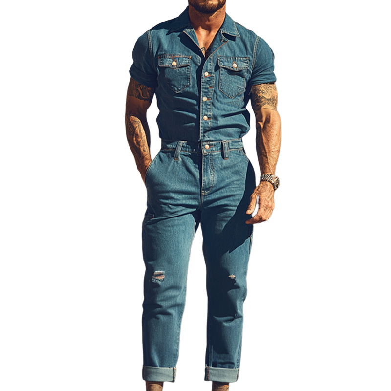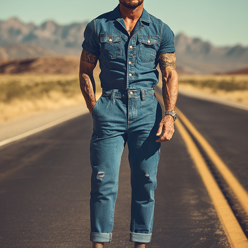 Men's Premium Denim Jumpsuit | Retro Western Cowboy Style | Summer Fashion | High-Quality Fabric | Pointed Yokes | Snap Buttons | Tailored Fit | Versatile Styling | Durable & Lightweight | Practical Design