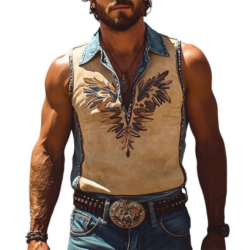 The Men's Summer Fashion Retro Western Cowboy Style Denim Stitching Suede Embroidered Tank Top is an essential addition to your summer wardrobe. With its durable denim construction, stylish suede stitching, and beautiful embroidery, this tank top perfectly combines comfort and trendy western style. Stand out this season and express your individual style with this eye-catching summer staple!