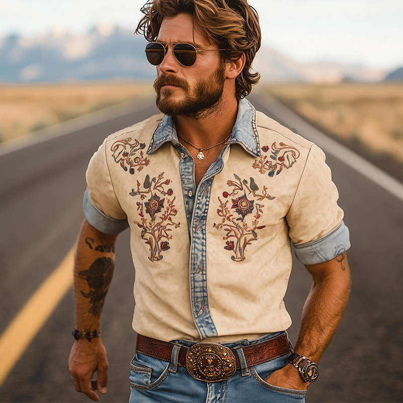 Men's Retro Western Cowboy Shirt | Summer Style | Denim & Suede Stitching | Embroidery Accents | Short-Sleeve Casual Shirt | Lightweight & Breathable | Versatile Outfit