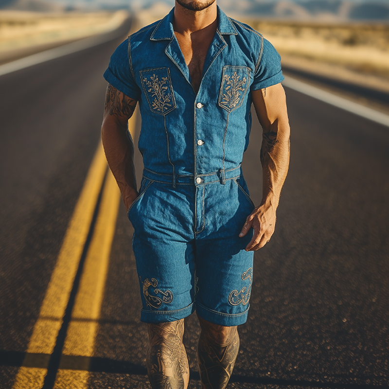 Elevate your summer fashion with the Men's Summer Fashion Retro Western Cowboy Style Pocket Embroidery Jumpsuit. This standout piece captures the essence of classic western charm while providing modern comfort and functionality, making it an ideal choice for warm-weather outings.