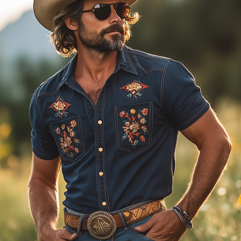 Men's Retro Embroidered Denim Shirt and Shorts Set | Summer Fashion | Casual Short Sleeve | Vintage Style | Lightweight Breathable Fabric | Classic Collar | Practical Pockets | Easy Care Machine Washable