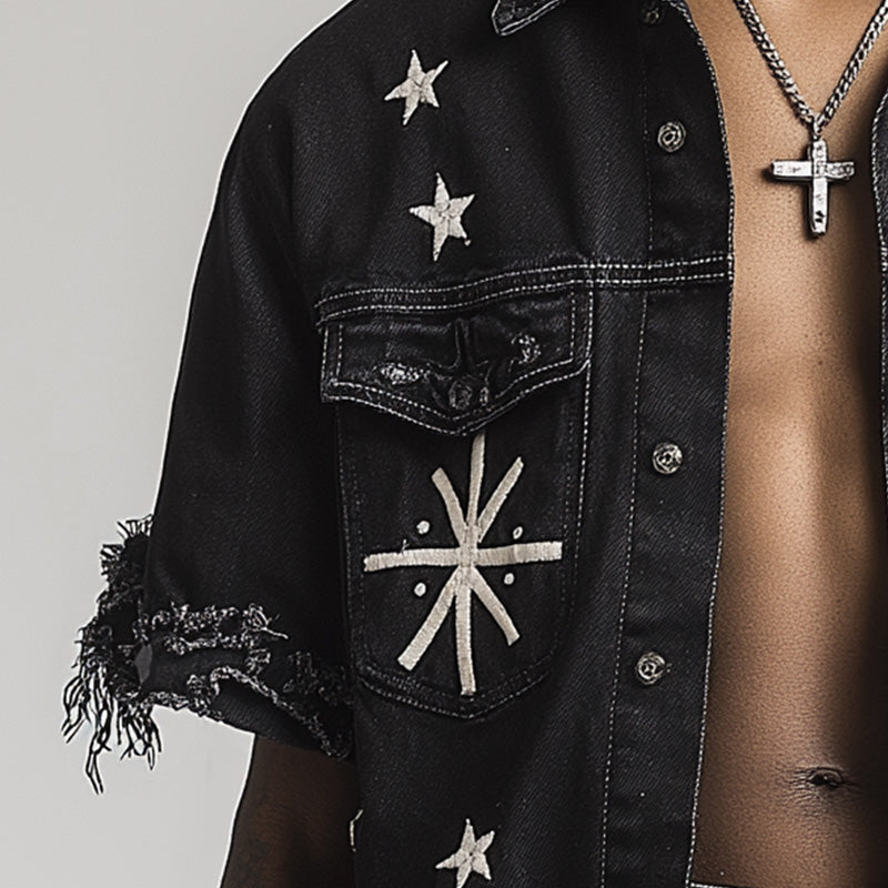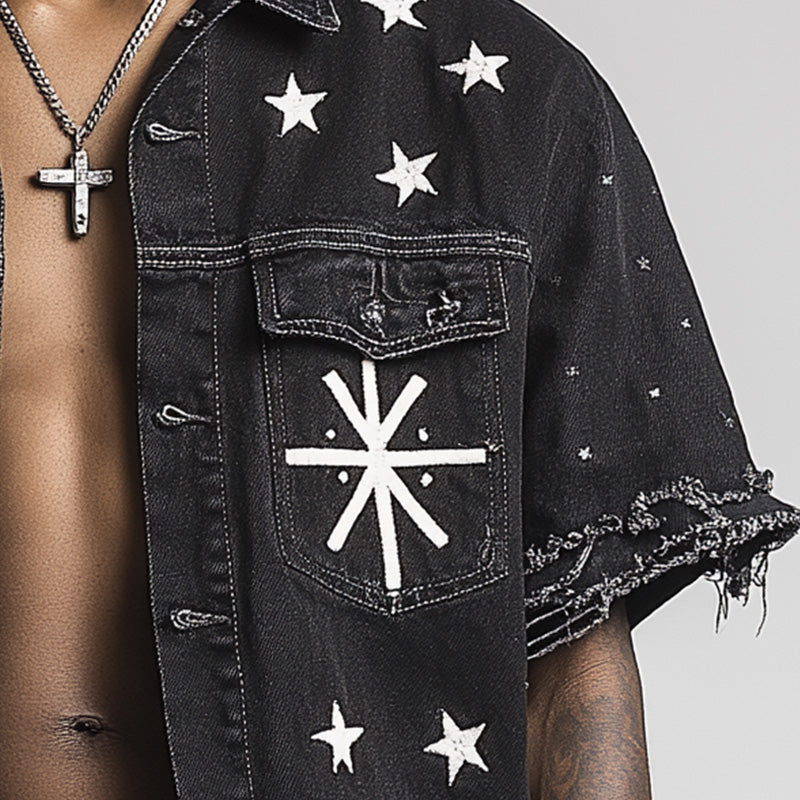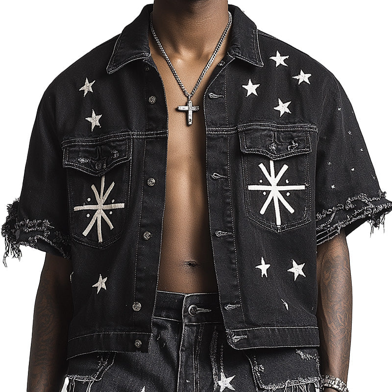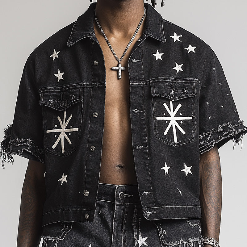 Men's Denim Shirt | Retro Print | Raw Edge | Casual | Short Sleeve | Lightweight | Vintage Style | Summer Fashion | Comfortable Fit | Breathable Fabric