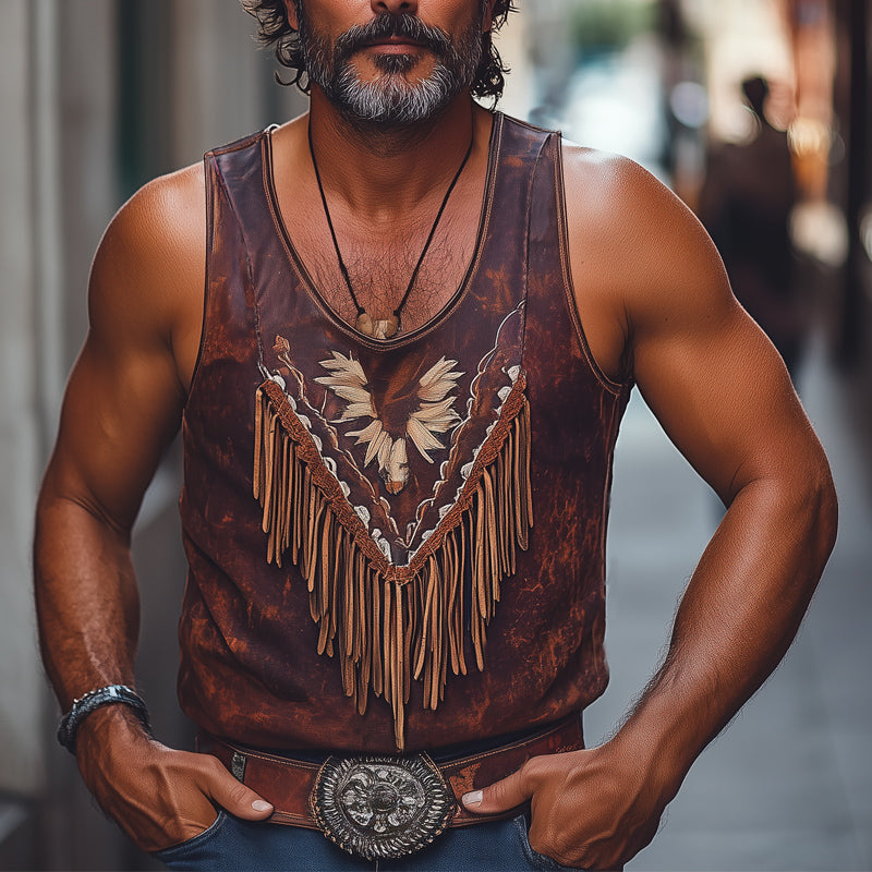 Men's Summer Retro Printed Tassel Stitching Tank Top