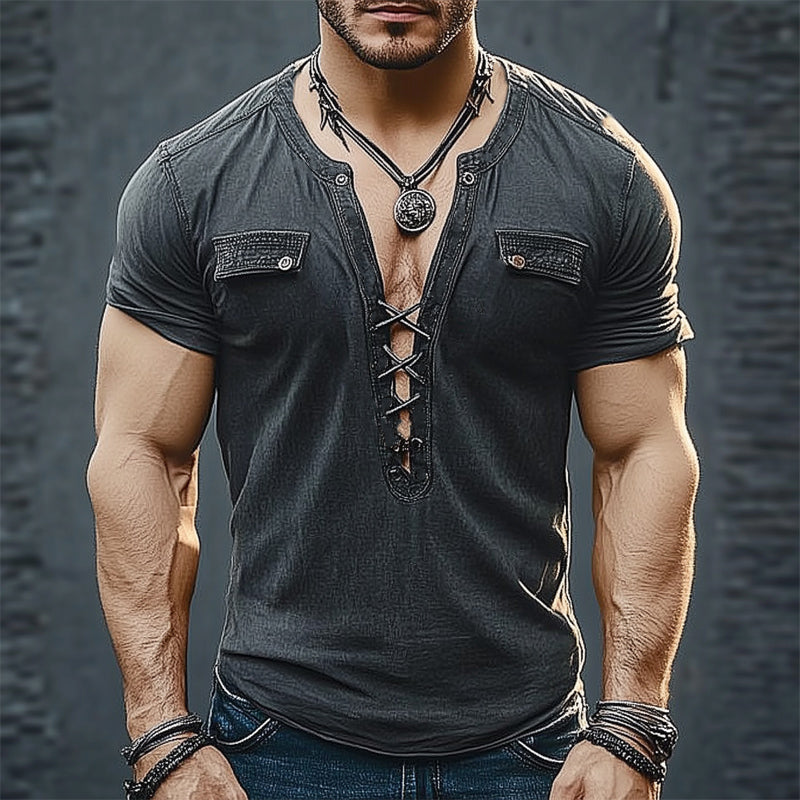 Indulge in this blend of retro charm and modern comfort with our Men's Summer Retro V-neck Lace-up Short-sleeved T-shirt – a true wardrobe staple for the stylish man.