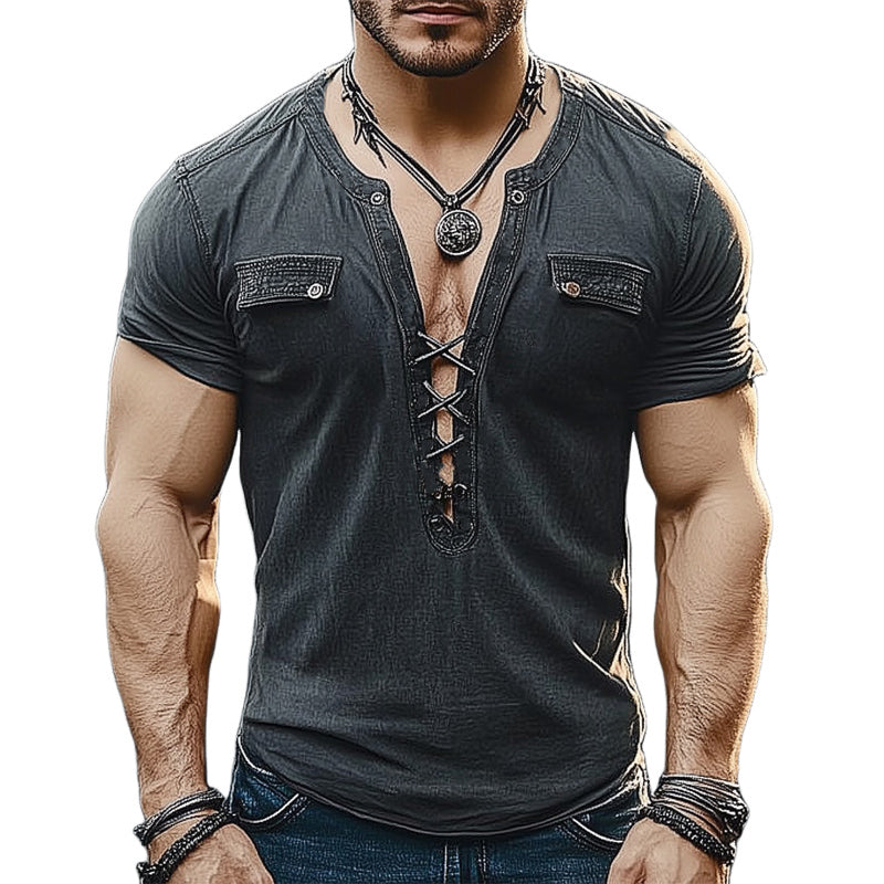 Men's Summer Retro V-neck Lace-up Short-sleeved T-shirt