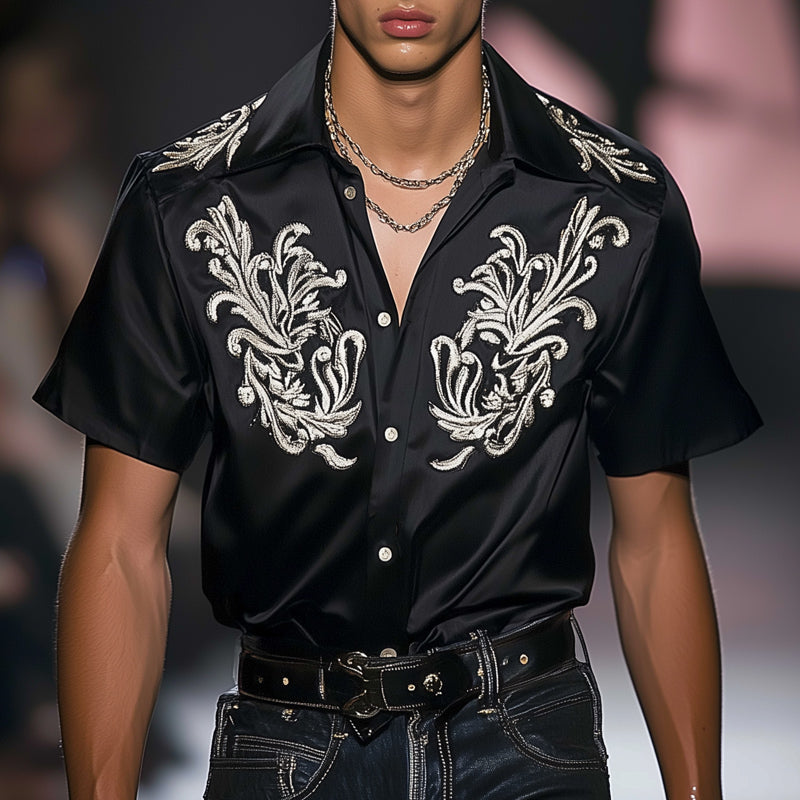 Elevate your summer wardrobe with the luxurious allure of our Men's Summer Satin Vintage Silver Embroidery Short Sleeve Shirt. This exquisite piece seamlessly merges vintage elegance with contemporary style, making it a standout choice for any fashionable occasion. The silky satin fabric drapes beautifully, creating a sophisticated look that’s accentuated by intricate silver embroidery. Perfect for evenings out or special occasions, this shirt promises to make a lasting impression with its unique design and refined details.