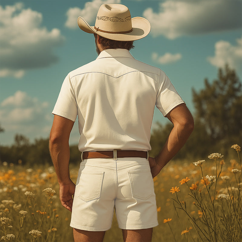 Men's Short Sleeve Shirt and Shorts Set | Western Cowboy Style | Retro Embroidery | Summer Fashion | Lightweight Cotton-Polyester Blend | Lapel Collar | Functional Pockets | Casual Outfit | Sizes S-3XL