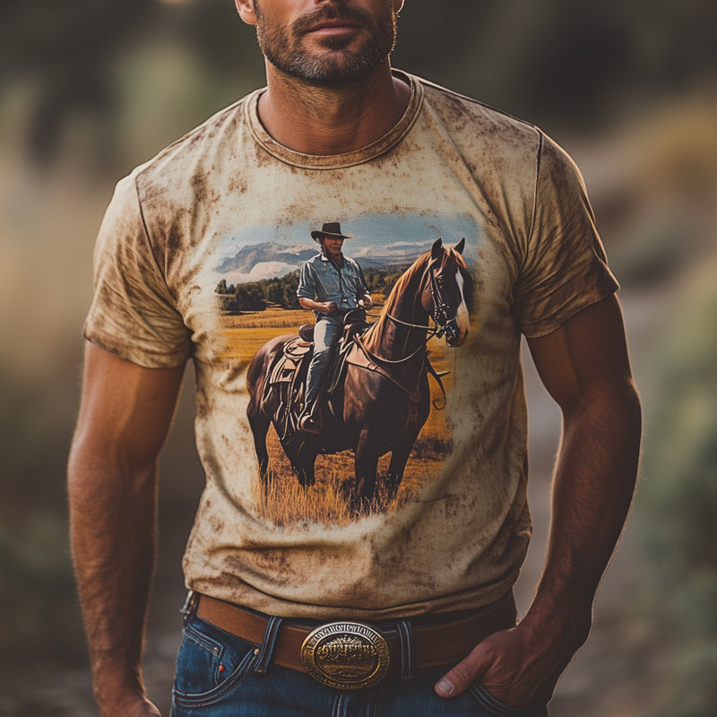 Infuse your summer wardrobe with classic western charm through our Men's Summer Western Cowboy Style Retro Print Round Neck T-Shirt. This t-shirt blends iconic cowboy motifs with retro prints, offering a distinctive look that’s perfect for expressing your unique style. Ideal for casual settings, this t-shirt keeps you comfortable and stylish whether you're exploring the great outdoors or enjoying a laid-back day in town.