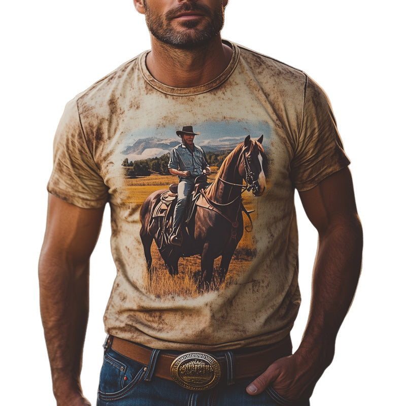 Men's Summer Western Cowboy Style Retro Print Round Neck T-Shirt