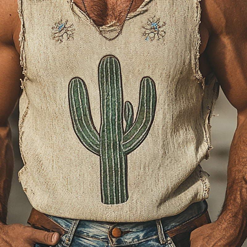Men's Vintage Tank Top | Cactus Embroidered | Breathable Fabric | Casual Style | Summer Apparel