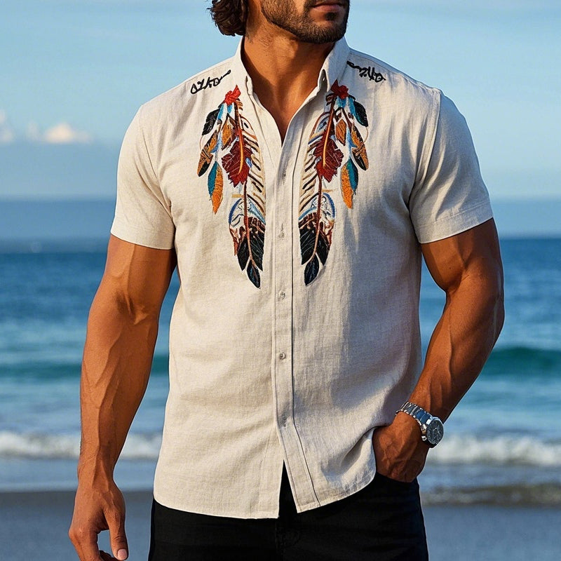 Men's Short Sleeve Shirt | Vintage Feather Embroidered | Retro Style | High Quality Fabric | Comfortable Regular Fit | Casual Summer Fashion | Classic Colors