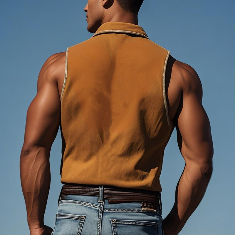Men's Vintage Western Sleeveless Shirt | Cotton Washed | Floral Embroidery | Lapel & Chest Pocket | Slim Fit | Rugged Elegance | Summer Essential | Western Aesthetic | Versatile Casual & Smart-Casual Wear